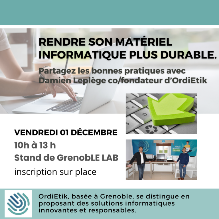 - Vendredi 1er décembre de 10h00 à 13h00 : Rendre son matériel informatique plus durable – partagez les bonnes pratiques avec Damien Lepiège co/fondateur d’OrdiEtik