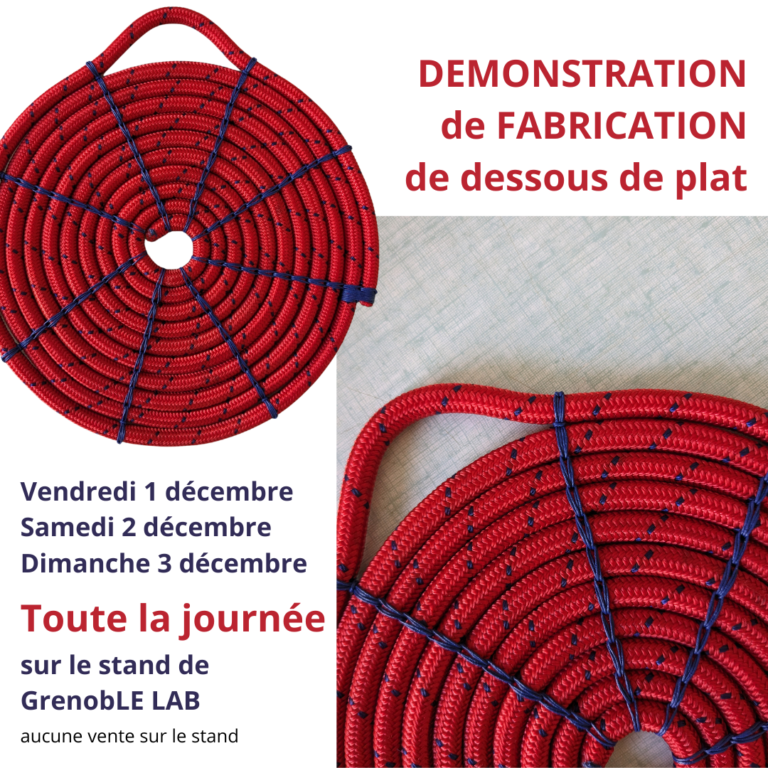 - Vendredi 1er, samedi 2, dimanche 3 décembre de 10h00 à 19h00 – Démonstration de réalisation de dessous de plat en cordes avec Chloé Félices – Designer textile